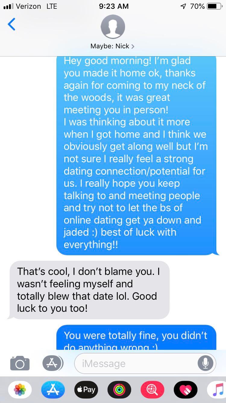 Back when I was dating getting a message like this would have meant a ton to me, it’s definitely hard to message you are not interested rather than just ghost, but it is easily the most considerate thing to do. Glad he took it well and wasn’t a dick about it either!
