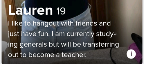 Tinder : I like to hang out, and have fun, and watch Netflix, and eat, and sleep. I’m doing generals. The office/f°r°i°e°n°d°s/pks&rec is not information about yourself