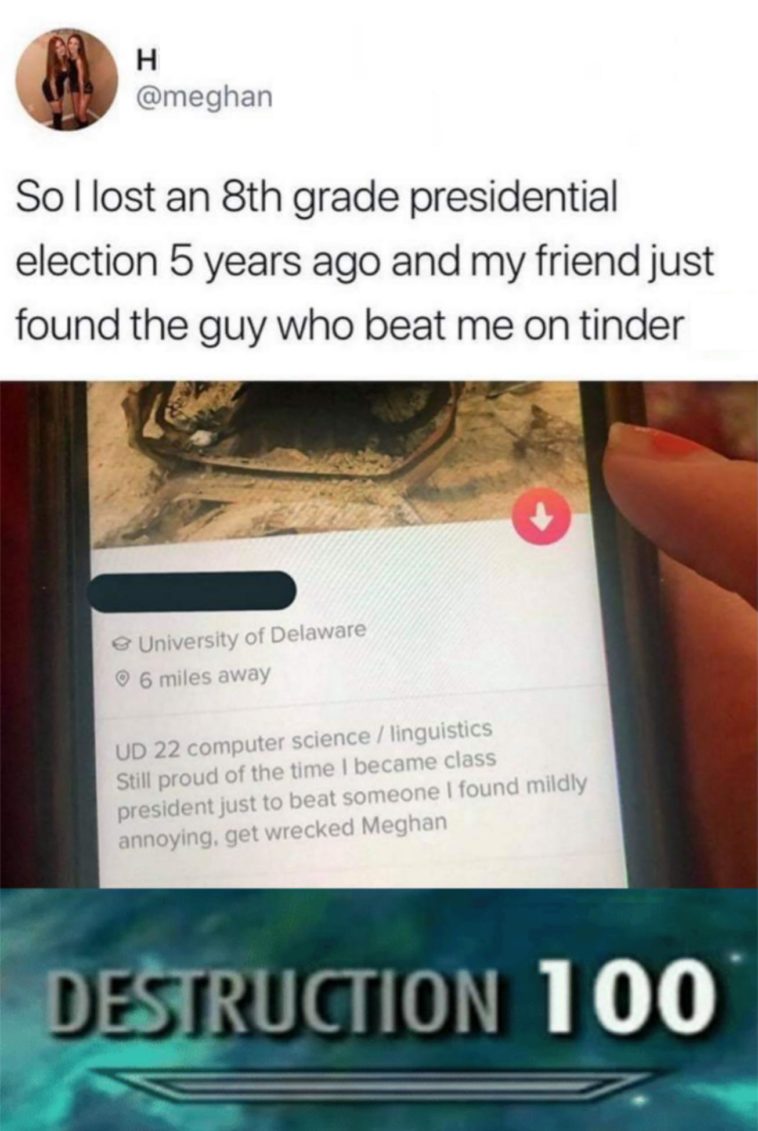 Swipe right and marry him just so you can divorce him for having a mildly annoying tinder bio