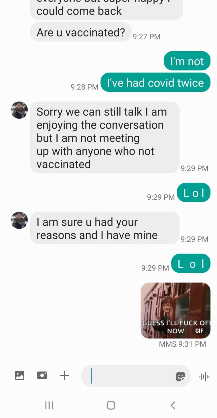 I guess it’s a blessing in disguise. If you’re that rigid about vaccination, then you’re gonna be far too rigid for me to like, in general.
