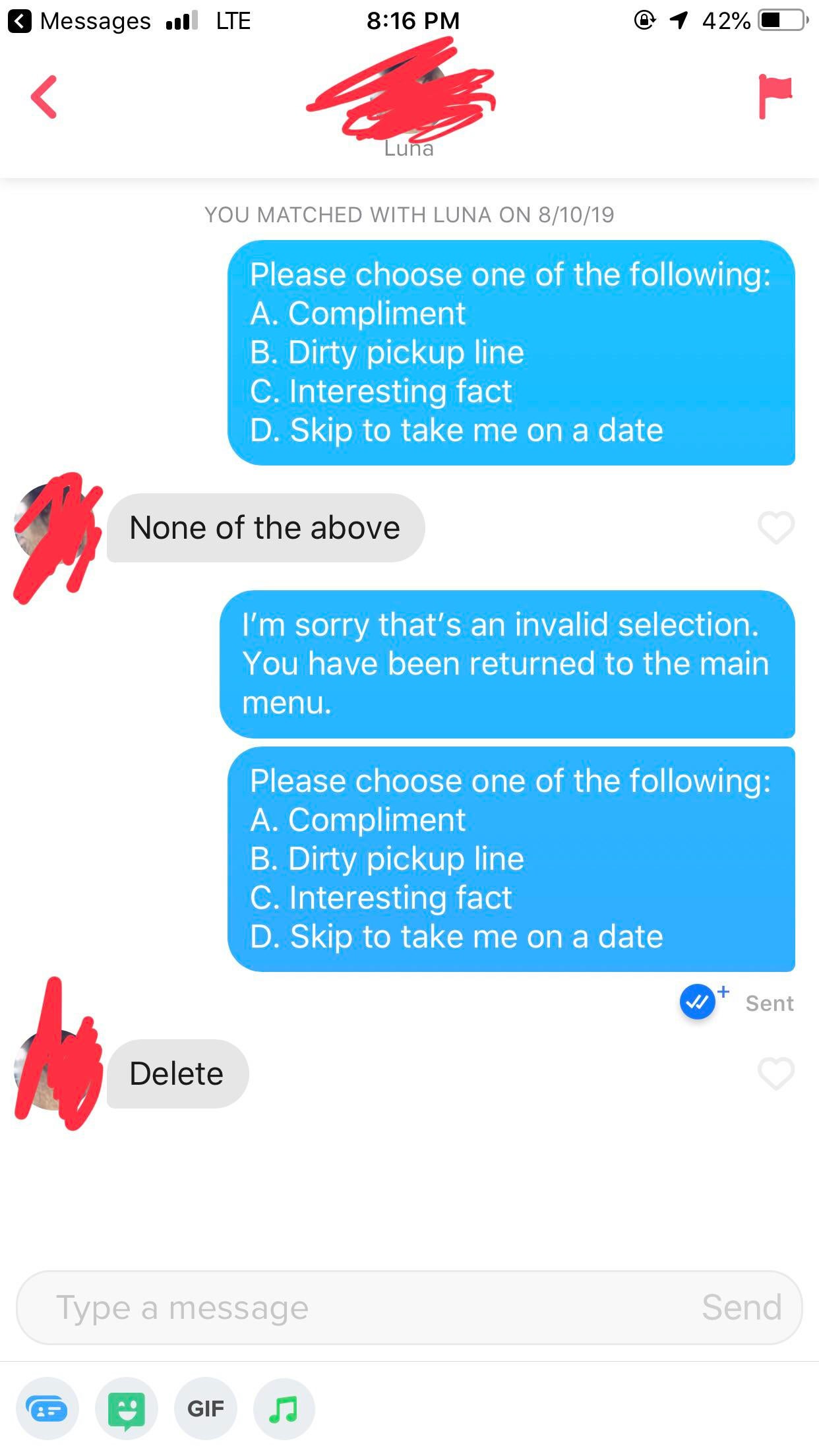 Tinder : I’m sorry that’s an invalid selection.