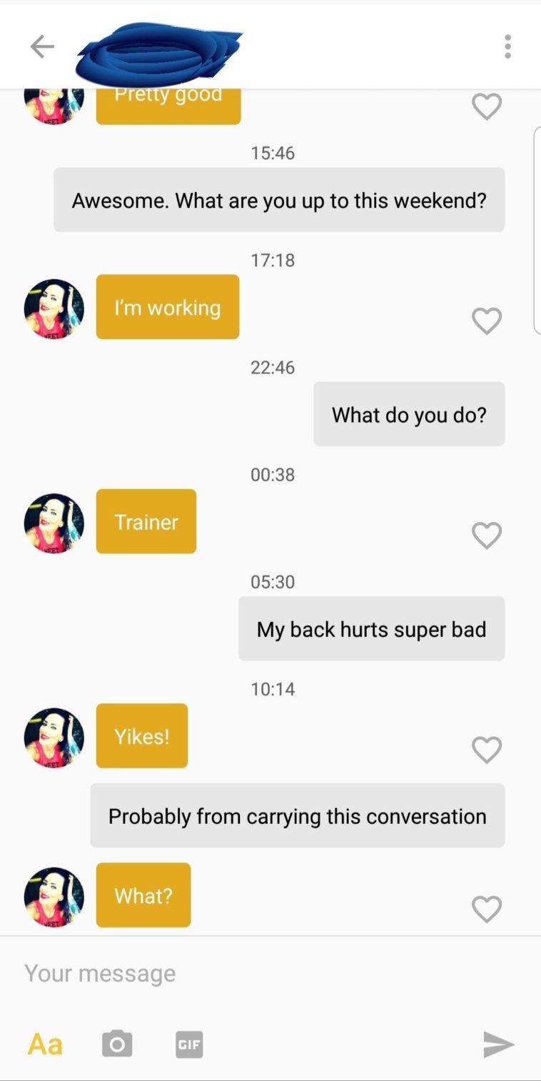 This same thing happened to me. Bumble girl with one word replies… then I pull the ol’ “back hurts from carrying the conversation” line. Post on reddit for karma!