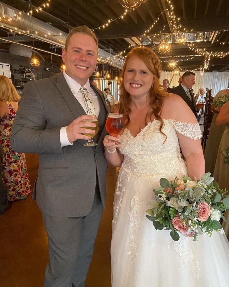 I am liking your personal taste! Off the shoulder gown, grey suit, that bouquet, and that tie! If that’s cider in your hands then this is the dream
