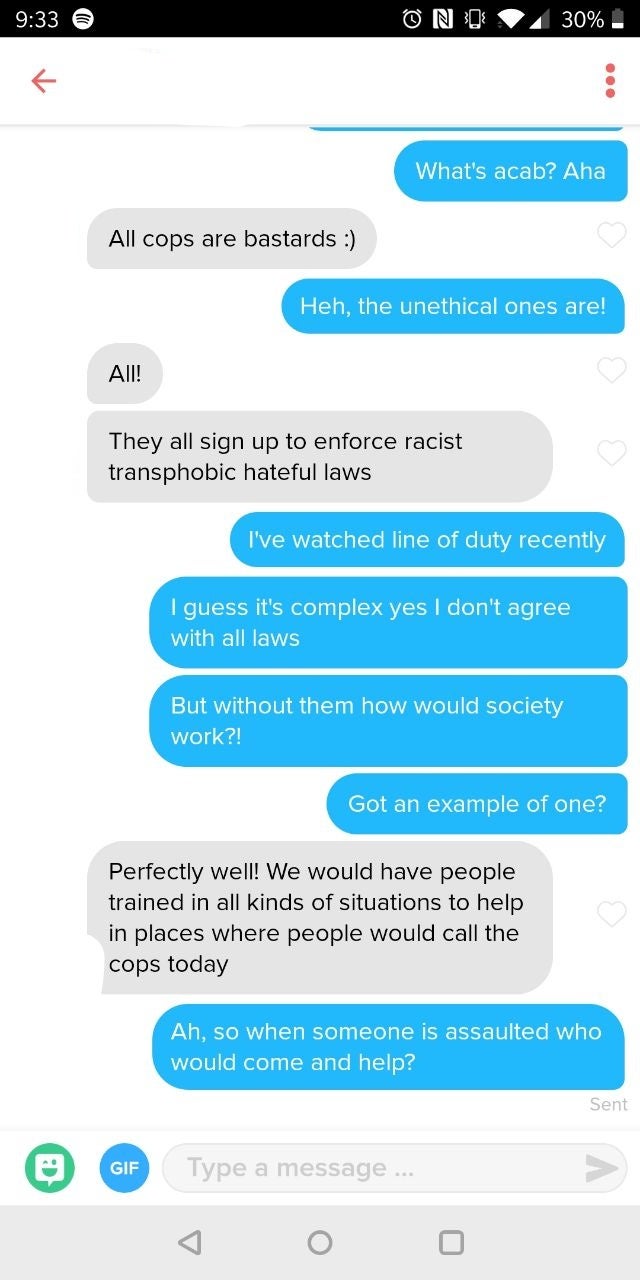 First of all, ACAB doesn’t really target the cops as a person but as an institution. It means that the cops are protecting themselves when they fuck up. For example in France, there is a lot of violence who should not happen if they were doing things right, eyes have been lost this past year in manifestations, people died while partying or closing their window because of a manifestation and we all know NO cop is gonna end guilty in justice (if they even go to justice because it seems no one can remember who fired anyway).