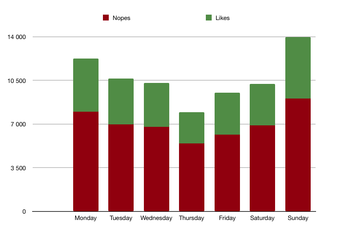 Tinder : [OC] My Tinder data – How many and which way I swiped on each day of the week the last 4 years