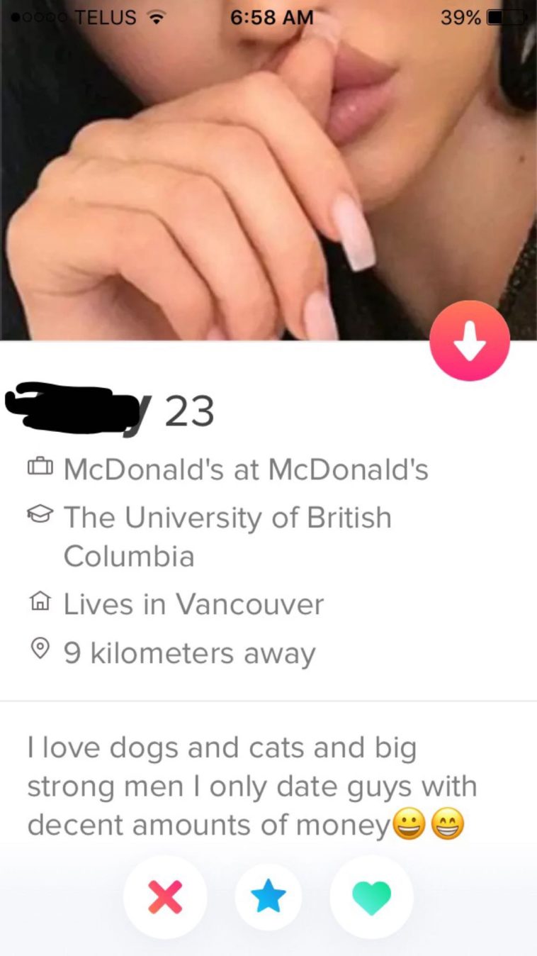 Tinder : Only Dates guys with lots of money. Works at Mcdonalds.