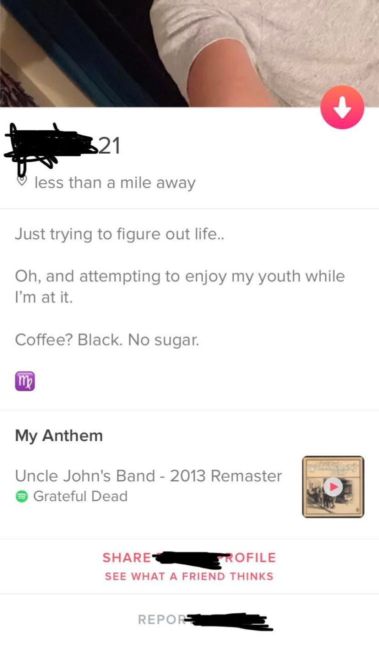 A guy is probably better off with nothing at all than two truisms, a coffee order, and a horoscope sign. But better yet, try writing something clever. Inject some personality, you know?