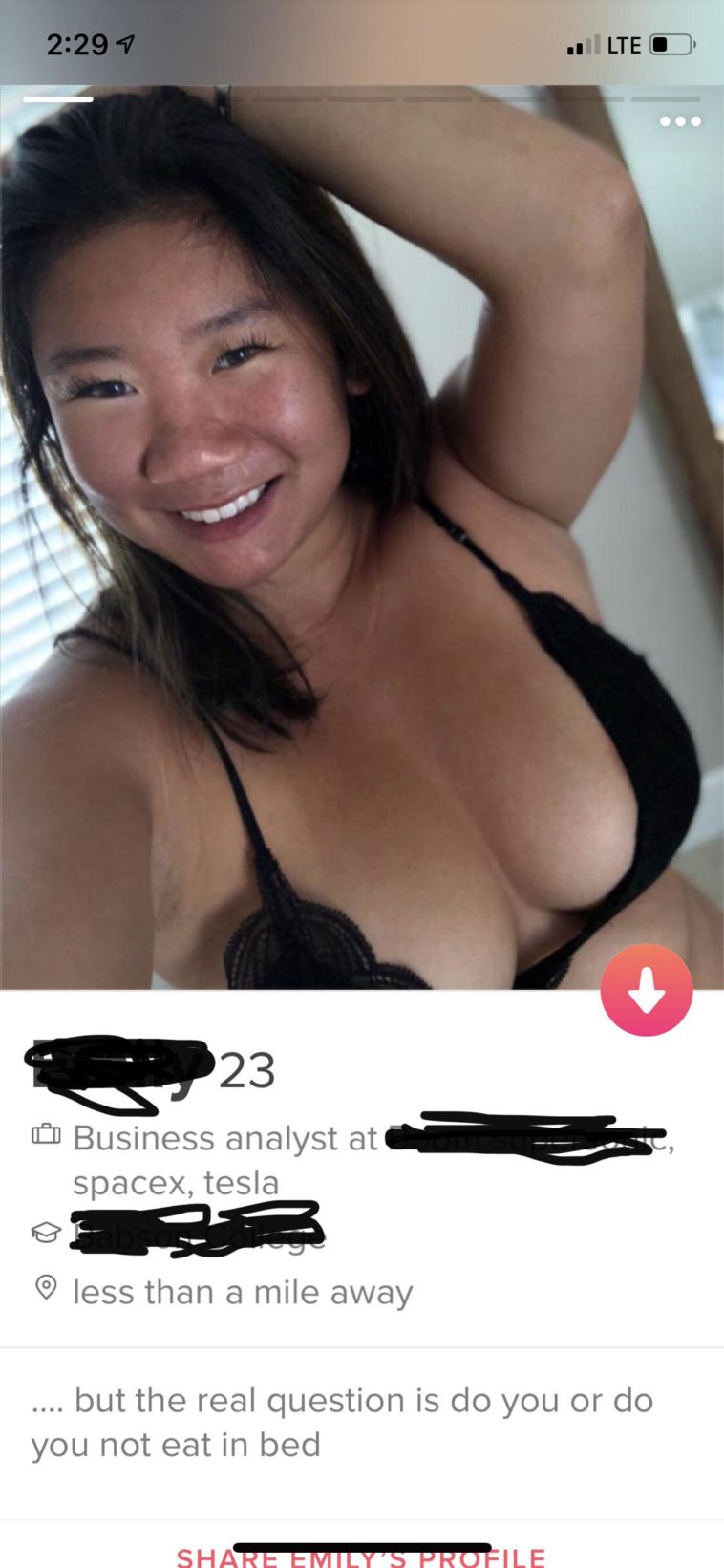 You’re Asian, most likely southern Chinese. You’re making a statement with the bikini pic « look at my tits » and because you cut it off without your stomach showing you’re probably moderately insecure about your body which probably means you have a little belly fat. The question in your bio is you trying to not be basic af but it sounds basic af « I’m so unique I eat in bed » unless you don’t eat in bed and are repulsed by it and then you’re not basic but you’re trying to be. You have a good job as an analyst so you’re probably pretty sharp and you included it in your bio which means you think it’s something that increases your worth which by extension means you probably care a lot about your career. You’re on tinder trying to meet guys so you’re probably socially awkward to some degree or perhaps are just surrounded by socially awkward people since you’ve failed to do so with conventional means. I guess that’s about it.