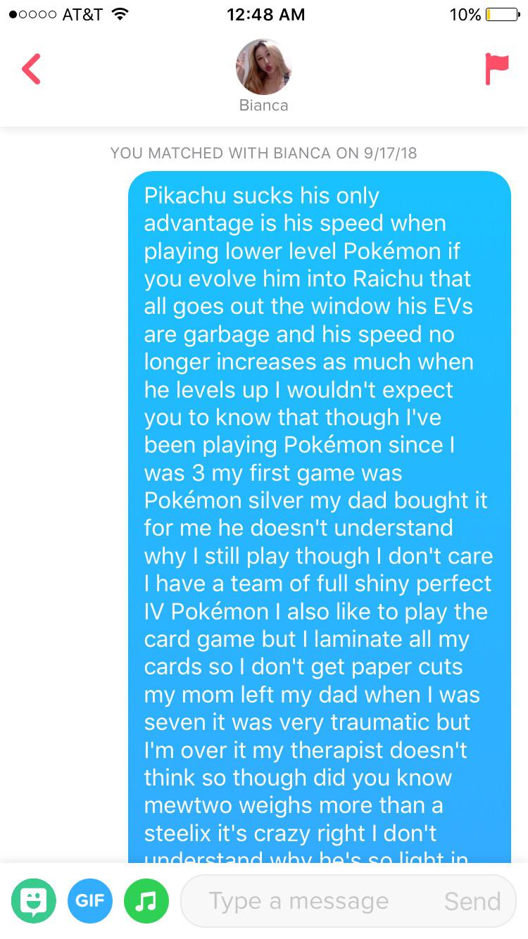 Tinder : She had a pikachu in one of her pictures, thought I’d give her a piece of my mind.