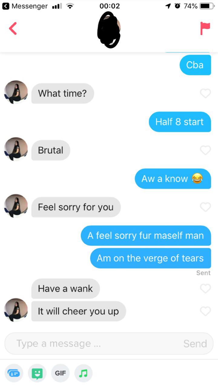 Tinder : Talk about work tomorrow, girl goes straight to 100.