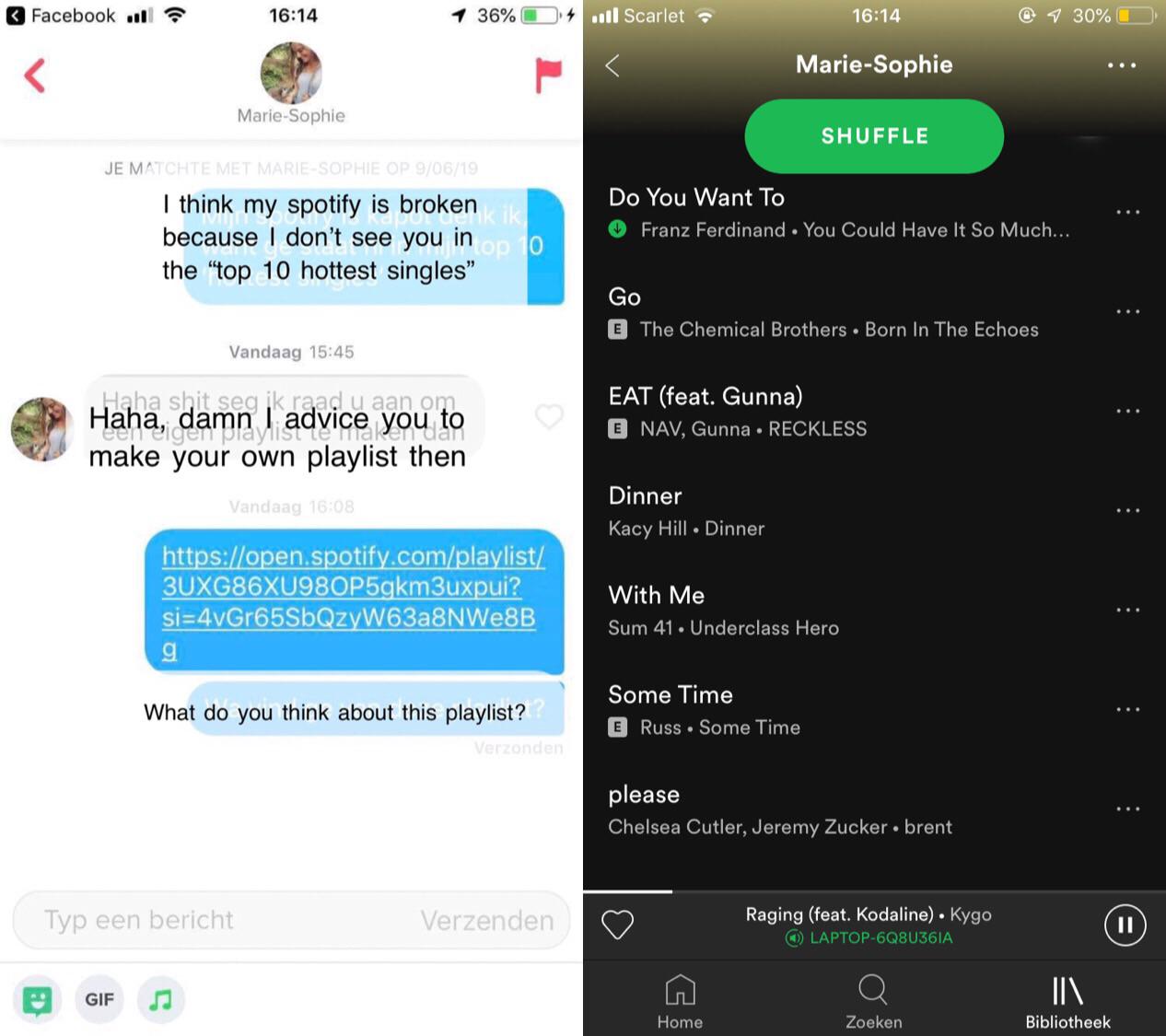 Tinder : The link redirects to the playlist seen on the right, normal conversation is in Dutch so I translated it