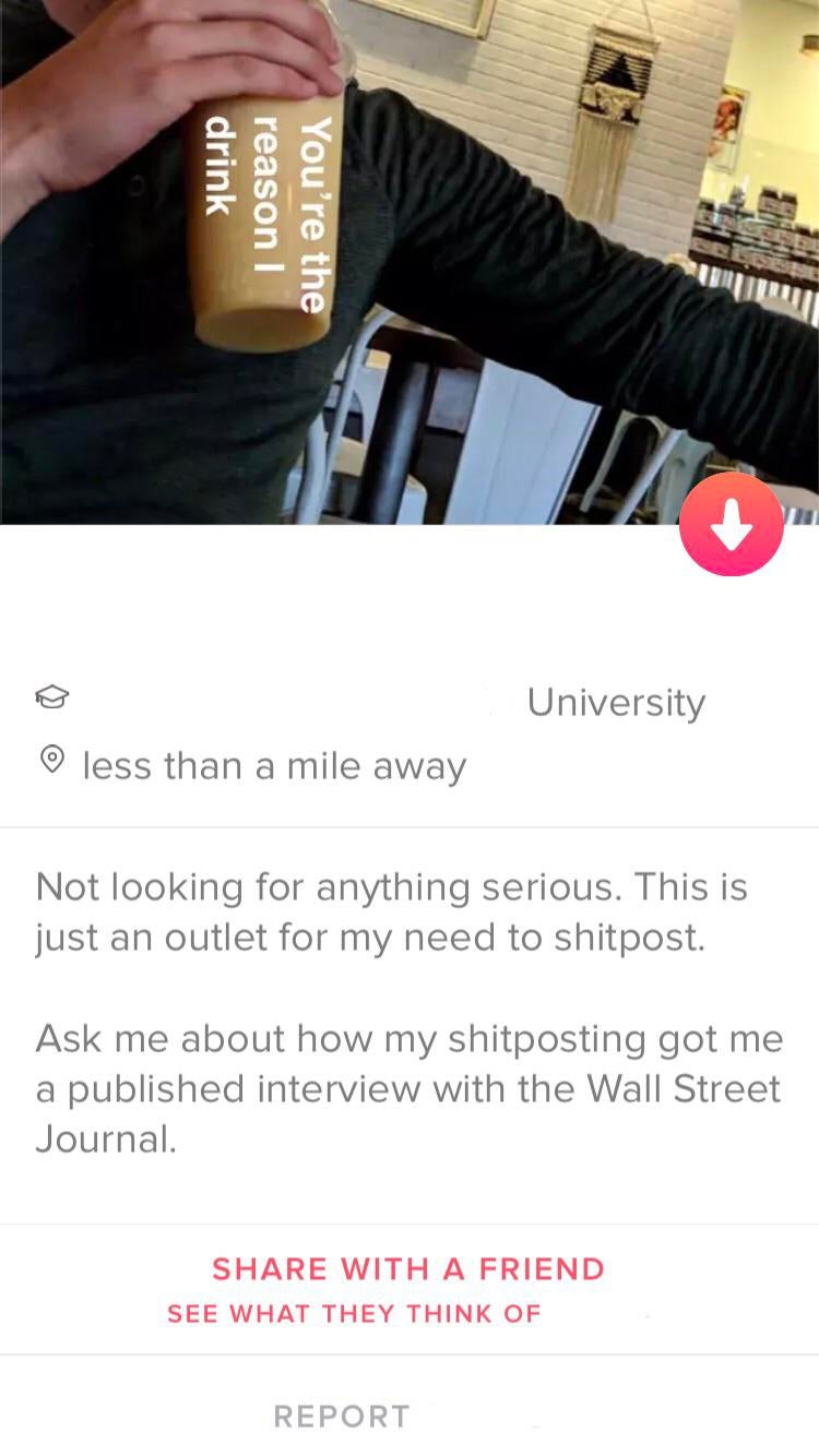 Tinder : They say honesty is the best policy so I figured I’d just go ahead and get the disappointment out of the way.