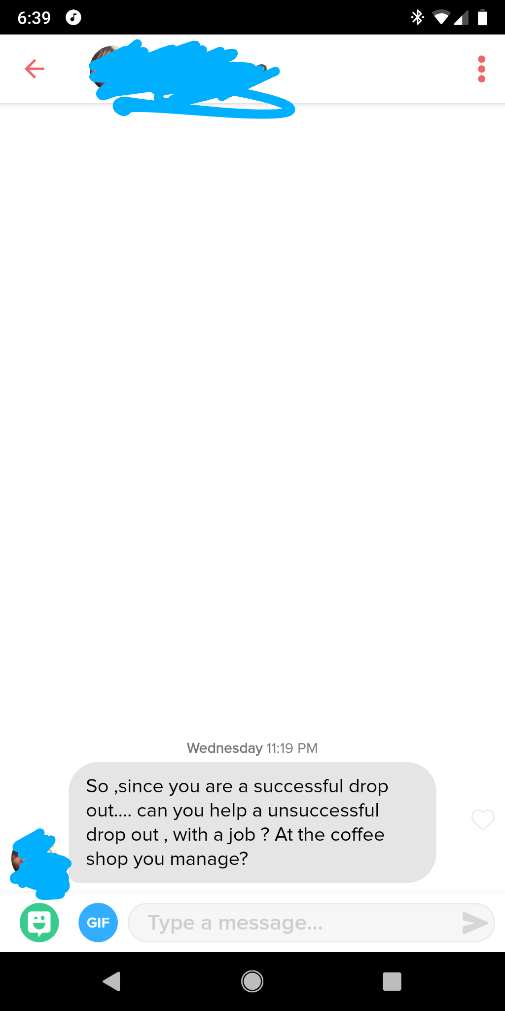 Tinder : This is my first time on Tinder in 2 months and I get this. I have a joke about being a college dropout and I manage a coffee shop.