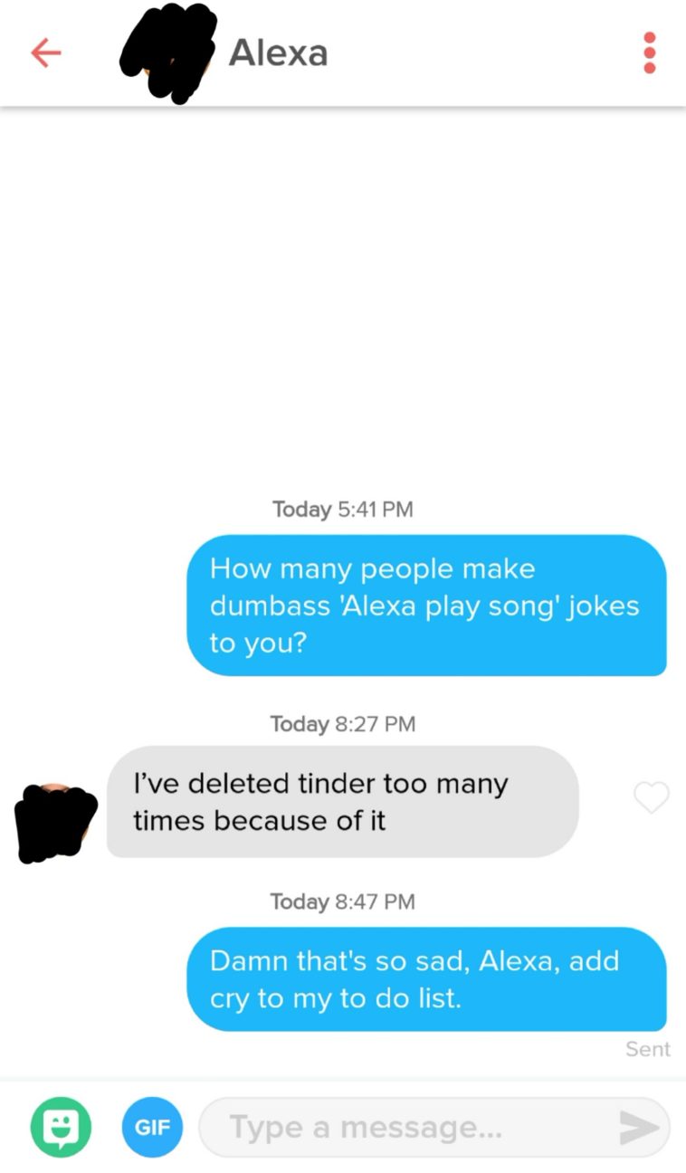 When you see a girl named Alexa on tinder, are you hoping for a match so you can play a variation of a terrible and unimaginative joke that’s been ridden to death and back on this website? Or do you decide to go that route sometime later?