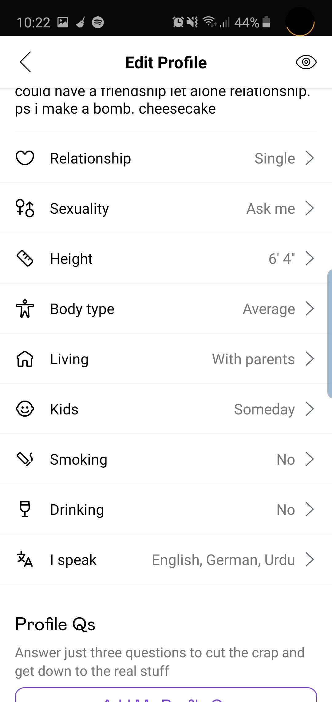 Ask me for sexuality implies you’re not straight. You live with parents in mid 20s and have Urdu as a language you speak. All this adds up to fat neckbeard.