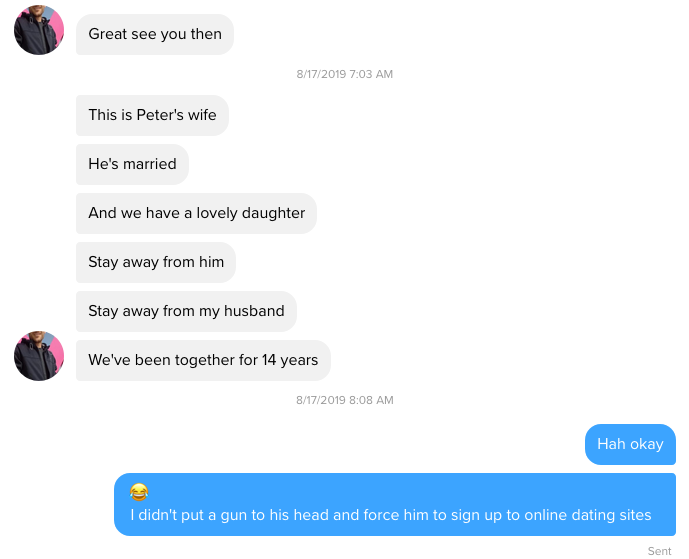 Does she really think that messaging this asshole’s matches on Tinder is going to save her marriage? That’s like unsinking the Titanic by using a cup measure to scoop away the ocean. Lady, your cheating husband is your problem, not other women.