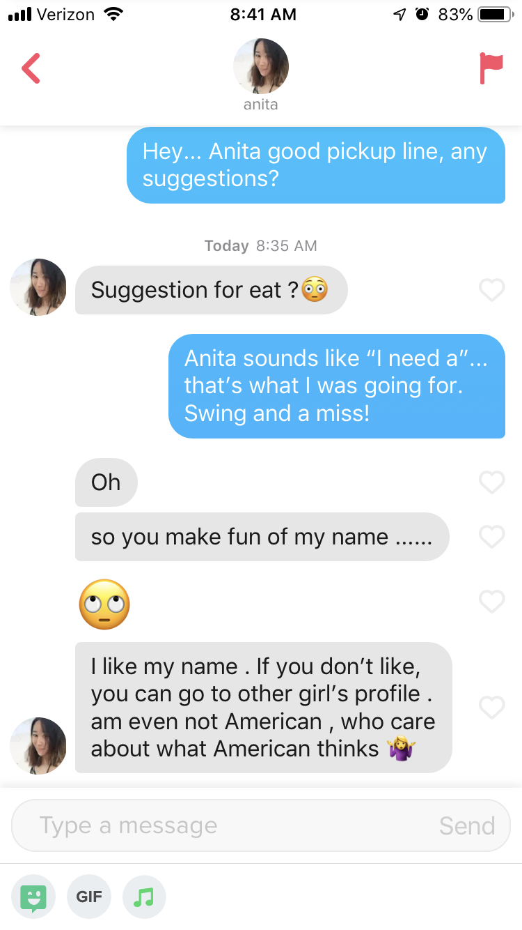 I agree with her. Why do people think that name based puns are the height of seduction on tinder?